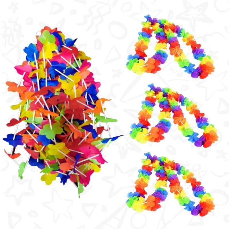 Cada collar está hecho con flores sintéticas suaves y vibrantes que se ajustan cómodamente, permitiendo que tus invitados bailen y disfruten sin parar. ¡Un accesorio infaltable para prender el ambiente y llenar de energía tu evento!